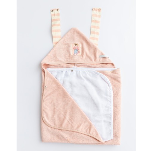 Toalha Multifuncional com malha atoalhada dupla e com fralda solta presa com botão. Alças para pendurar no pescoço com botões para soltar.