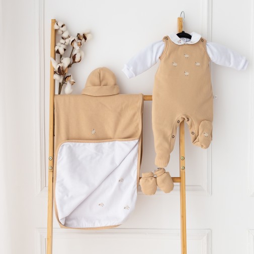 Saída Maternidade feita com 5 peças: Jardineira + Body Gola Bordada + Manta Dupla + Touca + Luva